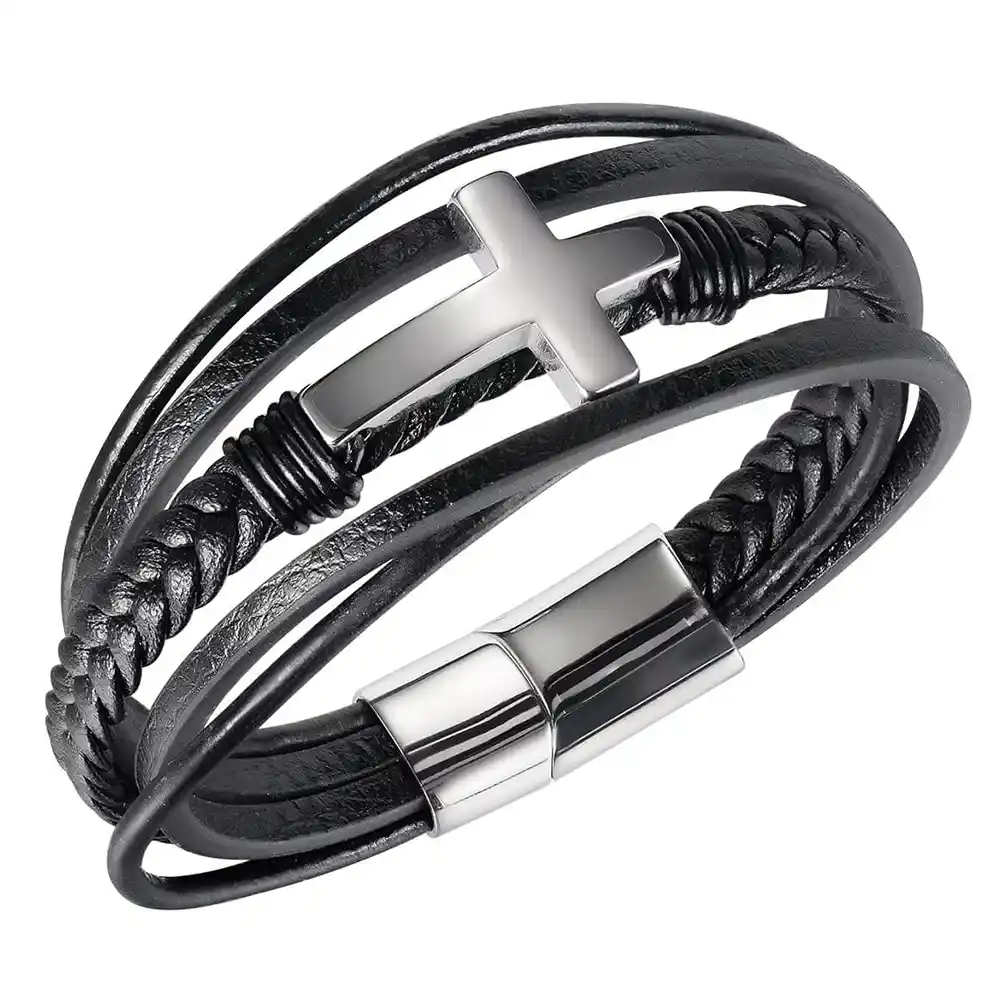 Schwarzes Armband aus Faserleder und mit Stahlkreuz.