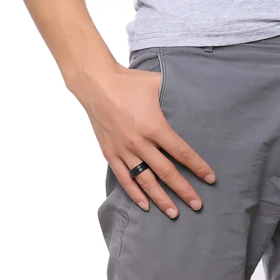 Dieser 8mm breite Ring hebt eine einzigartige, blau beschichtete Rille und eine elegante matte Oberfläche hervor.