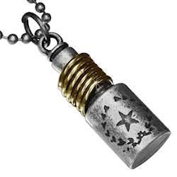 Halskette aus oxidiertem Stahl mit Ringen. Der Anhänger ist 4,5 cm lang und die dazugehörige Soldatenkette aus dunklem Stahl ist 65 cm lang, aber leicht zu kürzen. Super trendiger Männerschmuck.