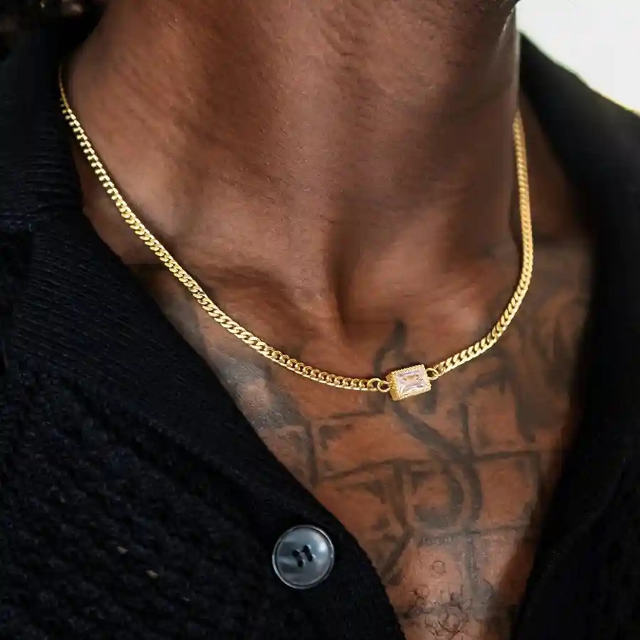 Golden Link CZ Halskette für Männer ist aus vergoldetem Edelstahl gefertigt und hat einen eleganten quadratischen CZ-Stein als Zentrum.