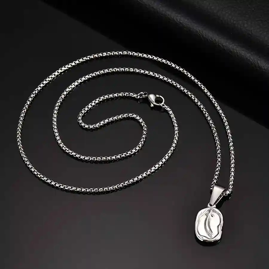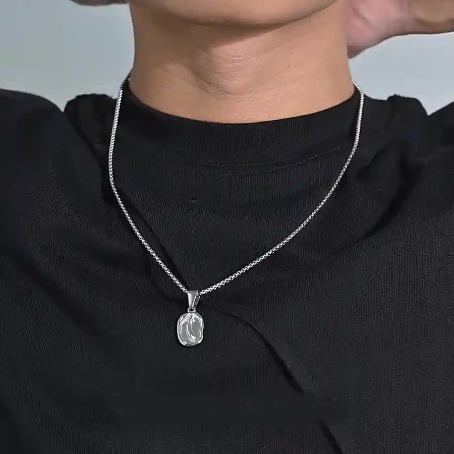 Ein stilvolles und einzigartiges ovales Schmuckstück für Männer aus haltbarem Edelstahl. Das organische Design misst 2,05 × 1,22 cm, und die schlanke Kette wird in 60 cm Länge geliefert. Mit seiner Leichtbauweise von nur 4 g ist dies ein subtiles Statement für jeden Mann, der einen modernen und zeitlosen Look wünscht.
