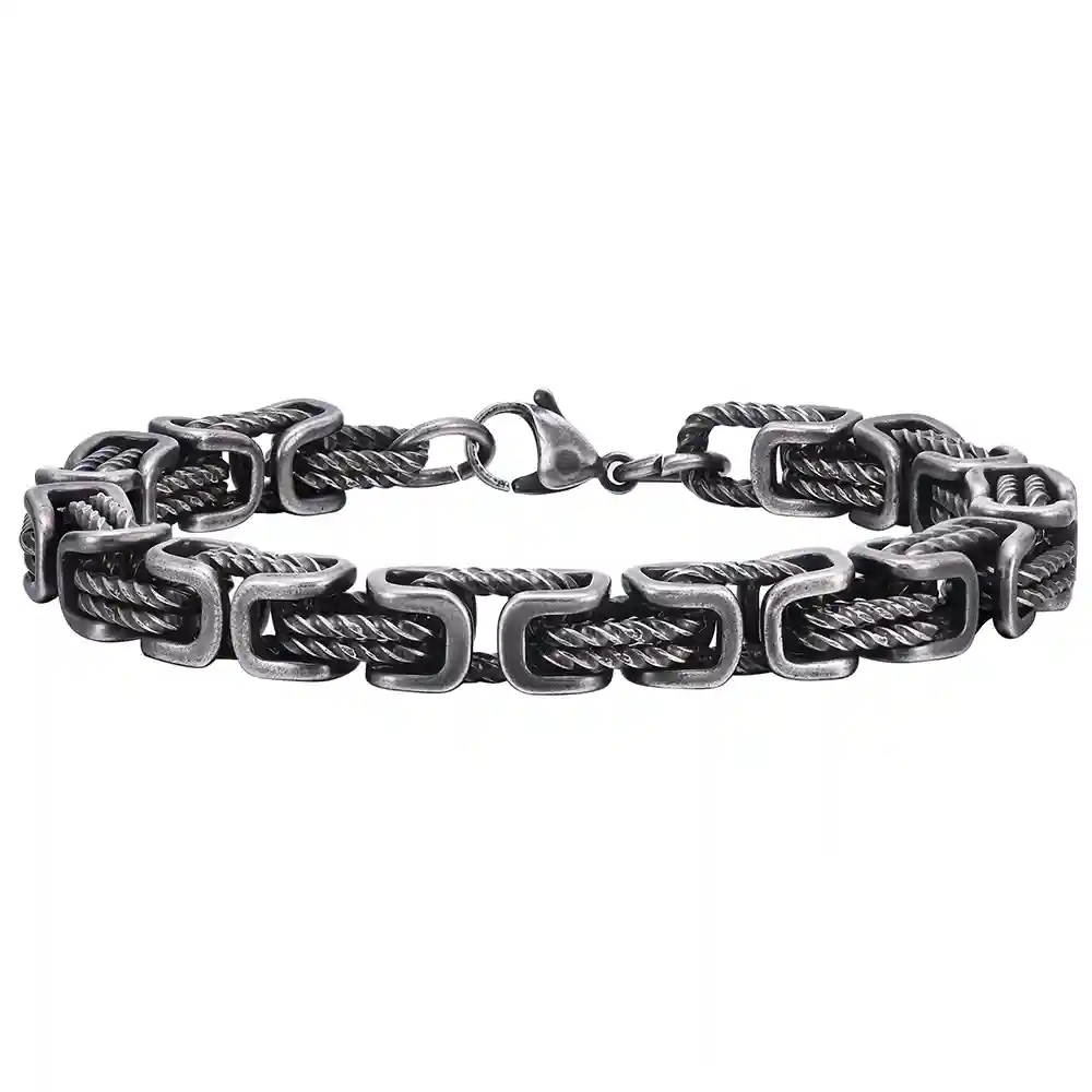 Dieses Herrenarmband aus oxidiertem Edelstahl ist für den Mann entworfen, der einen markanten Look möchte, ohne Kompromisse bei der Qualität einzugehen. Die kräftige 8 mm Kette kombiniert geflochtene Stahlseile mit kantigen Gliedern, die dem Armband einen industriellen und maskulinen Ausdruck verleihen.