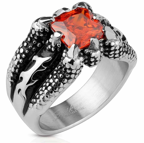 Der rote Flammenstein wird von Drachenklauen in glänzendem Edelstahl gehalten – ein Symbol für Stärke, Feuer und rohe Männlichkeit. Der Ring ist schwer, detailliert und für Männer mit Kante entworfen.