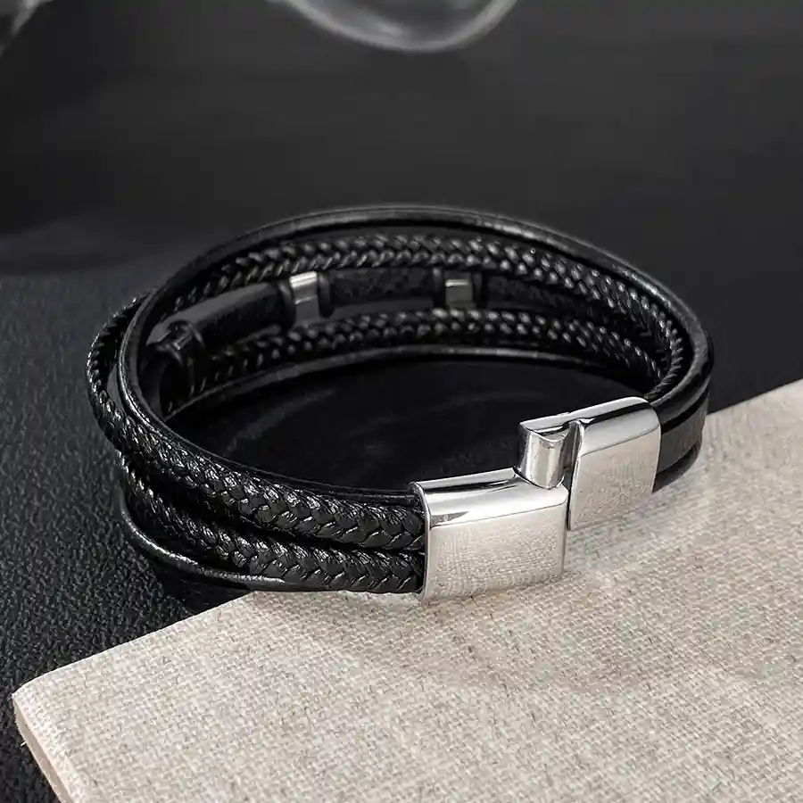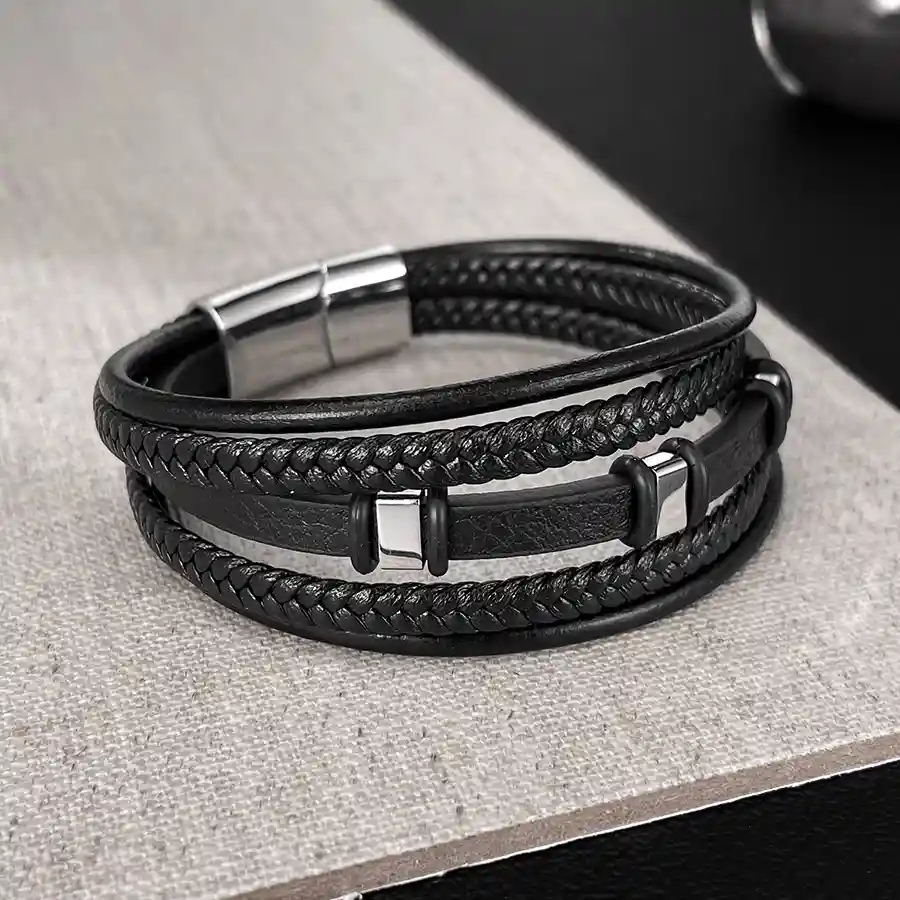 Das Armband ist 20 cm lang und kombiniert geflochtenes und glattes Lederlook mit einem soliden Magnetverschluss aus Stahl.